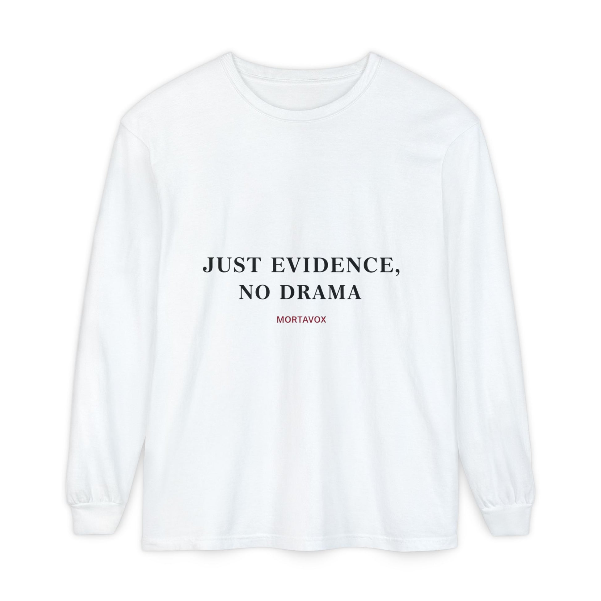Slip this long-sleeve on when you’re settling in for a true-crime deep dive or debating evidence with fellow fans. The soft, garment-dyed cotton drapes easily over shoulders and carries the understated slogan “no drama just evidence” like a quiet declaration — part inside joke, part manifesto. The ribbed cuffs keep sleeves in place during note-taking or late-night coffee runs. Double-needle hems and twill neck/shoulder tape mean it holds shape through repeated wear and washings. It feels worn-in from the first wear, pairing naturally with jeans for a relaxed recording-session vibe or with a flannel for chilly case-review nights. For Mortavox listeners and true-crime collectors who prefer their fandom low-key and practical, this shirt speaks the same language: methodical, curious, and ready to dig into the facts.